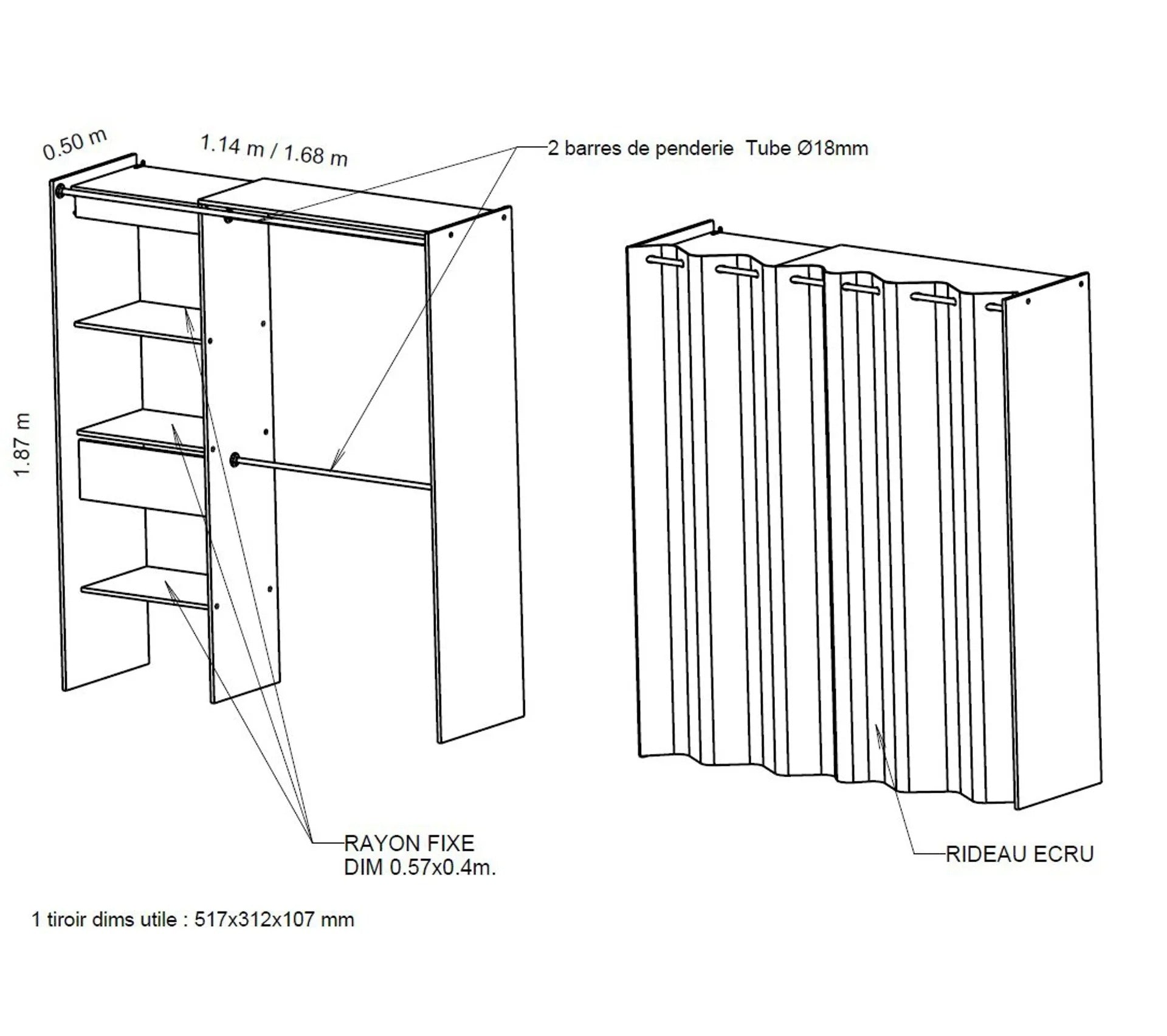 Tiroir1 tiroir 51,7 X 31,2 X 10,7 cm - 3 rayons fixes 57 X 40 cm - 2 barres de penderie