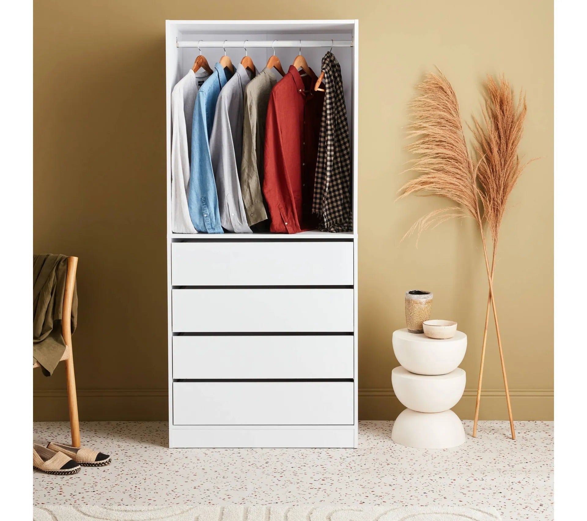 Avec ses 4 tiroirs et sa penderie, ce module dressing offre de belles possibilités de rangement.
